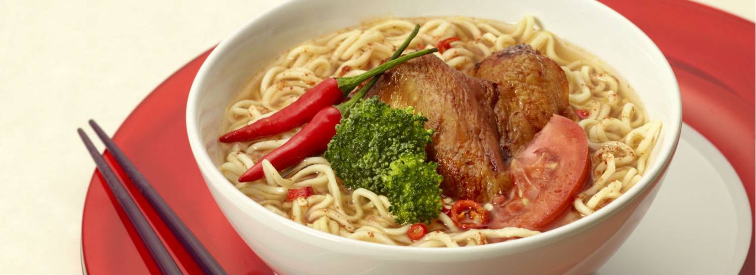 Chicken Flavour Noodles with Prawn Wantons and Kai Lan
